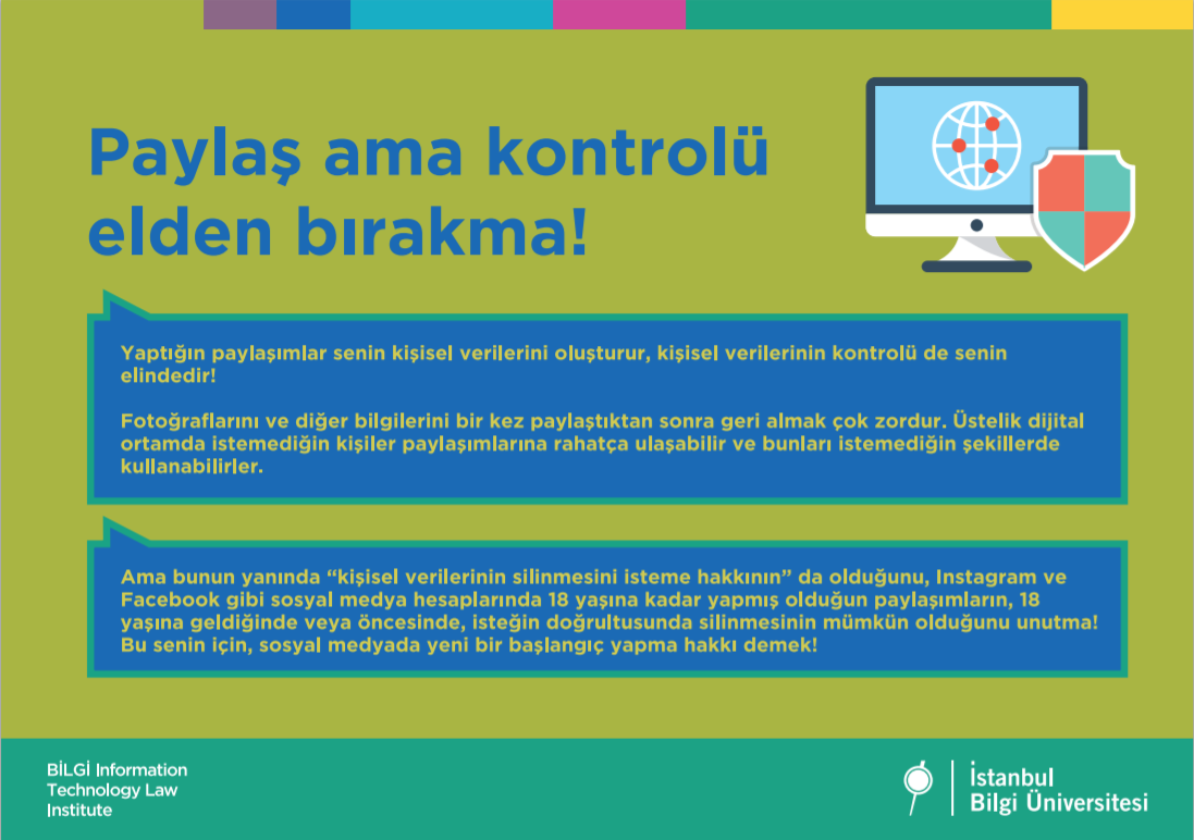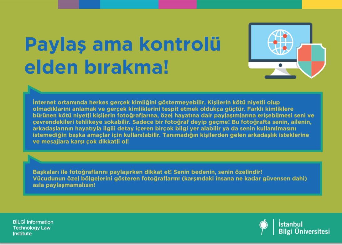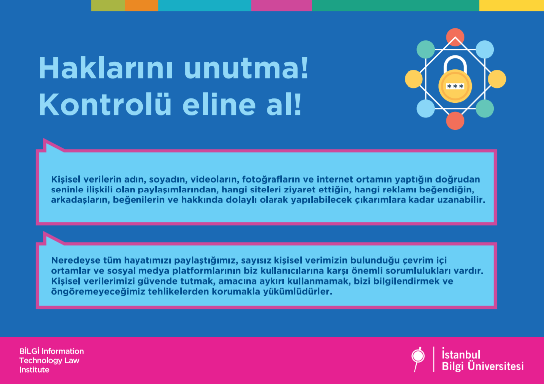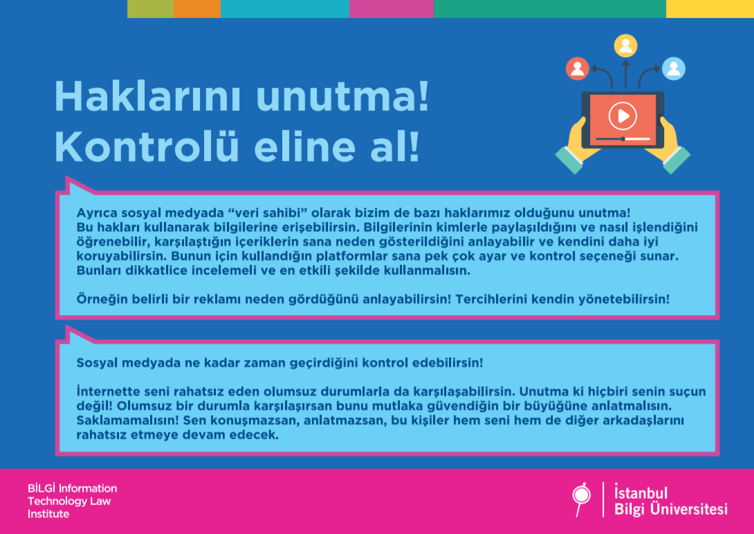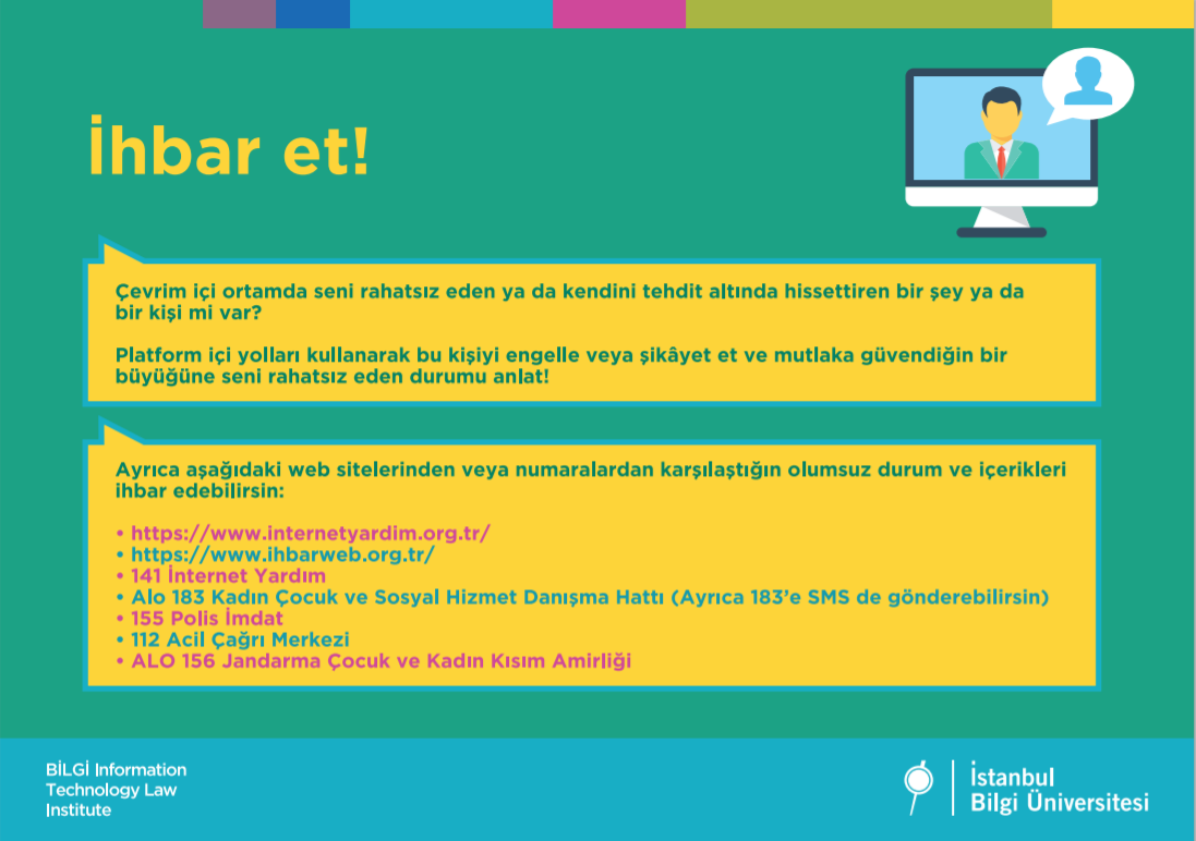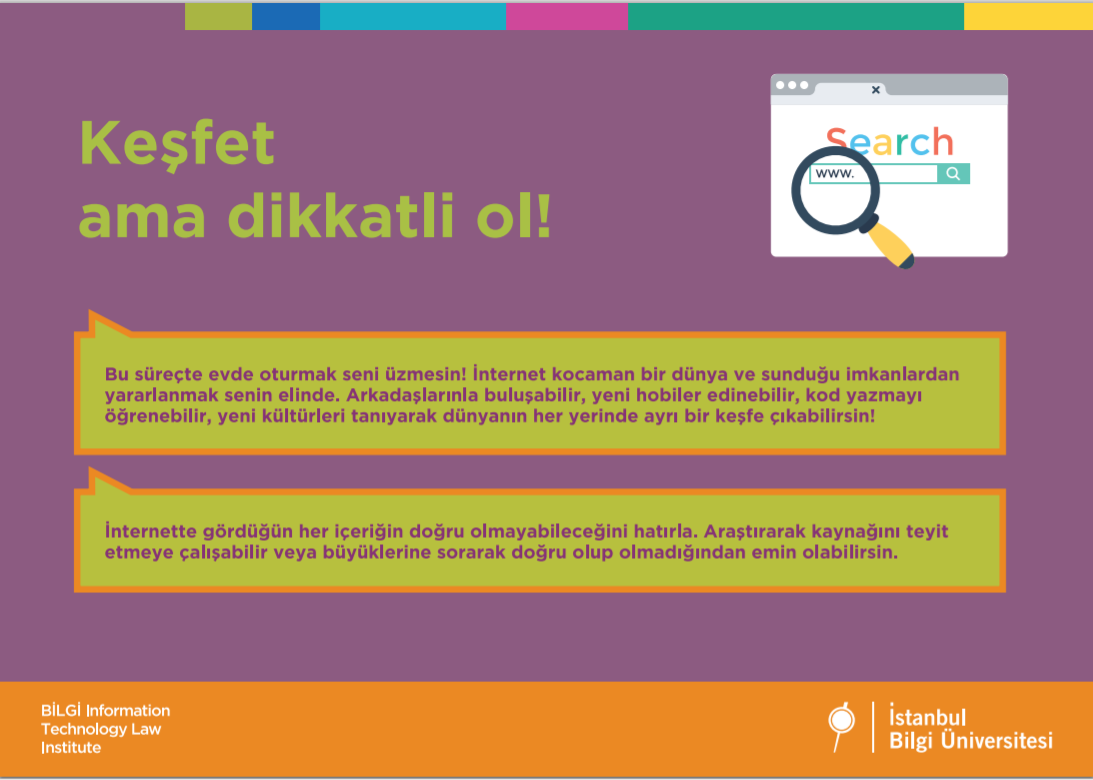 Bu günlerde tüm vaktimiz evde geçiyor ve interneti normalde olduğundan çok daha fazla kullanıyoruz. Biz de İstanbul Bilgi Üniversitesi Bilişim ve Teknoloji Hukuku Enstitüsü olarak bugün senin yanında olmak, internetten nasıl daha iyi yararlanabileceğini ve güvenliğin için nelere dikkat etmen gerektiğini senin için hazırlamış olduğumuz renkli bir sunumla anlatmak istedik.